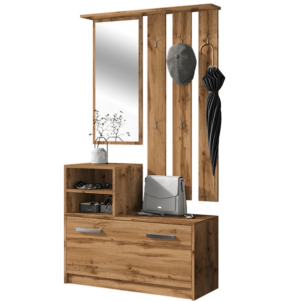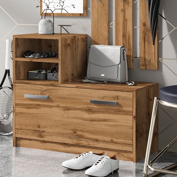 Este mueble recibidor tiene un estilo moderno, cuenta con varios estantes y capacidad para almacenar unos 8 pares de zapatos