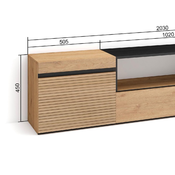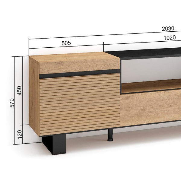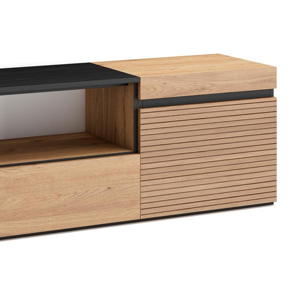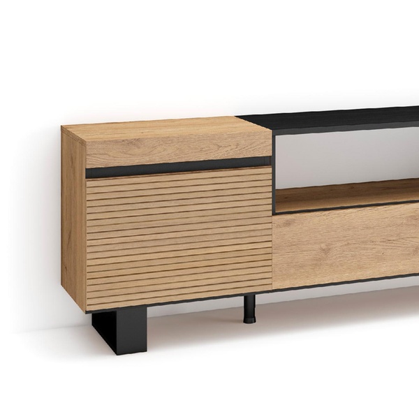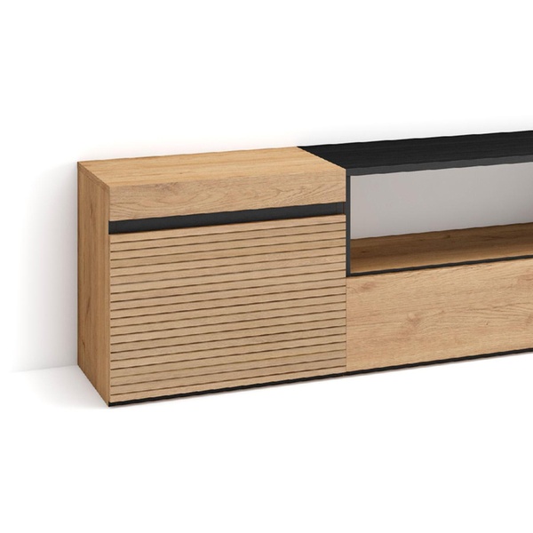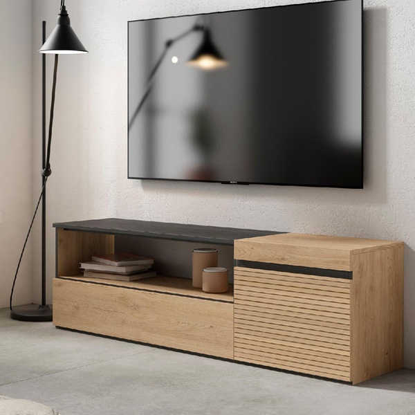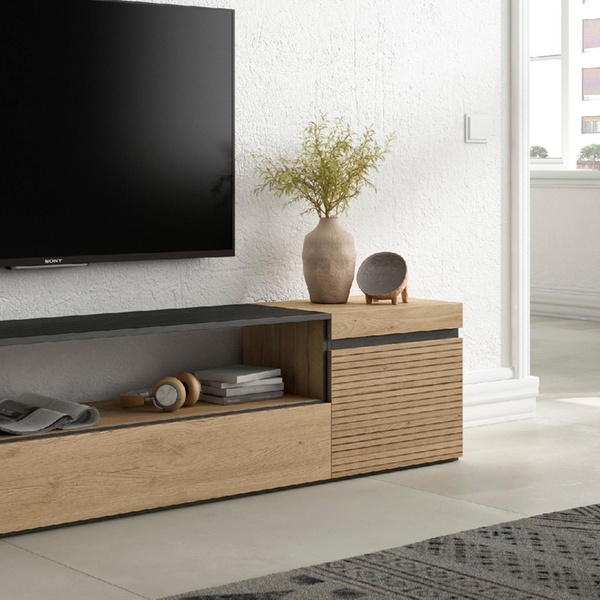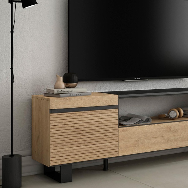 Con un diseño moderno de estilo industrial, este mueble para TV ofrece una gran capacidad de almacenaje y distintas opciones de personalización