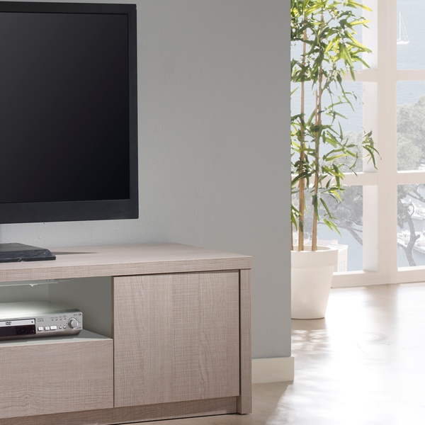 - Mesa TV con cajón central, dos puertas laterales y un compartimento central con luz