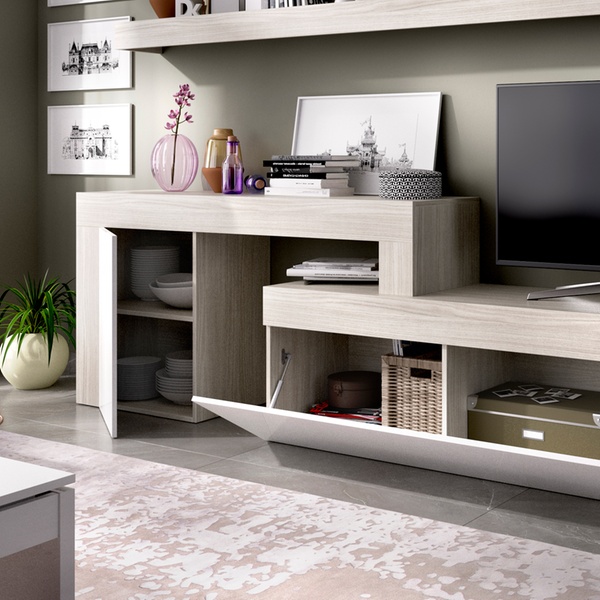 - Mueble TV modular extensible (se pueden solapar los dos módulos bajos a la altura deseada - entre 260 cms y 300 cms)