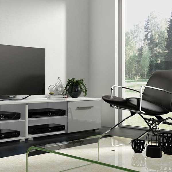 Este mueble TV Tenus esta disponible con tamaños simple y doble, con o si luces LED