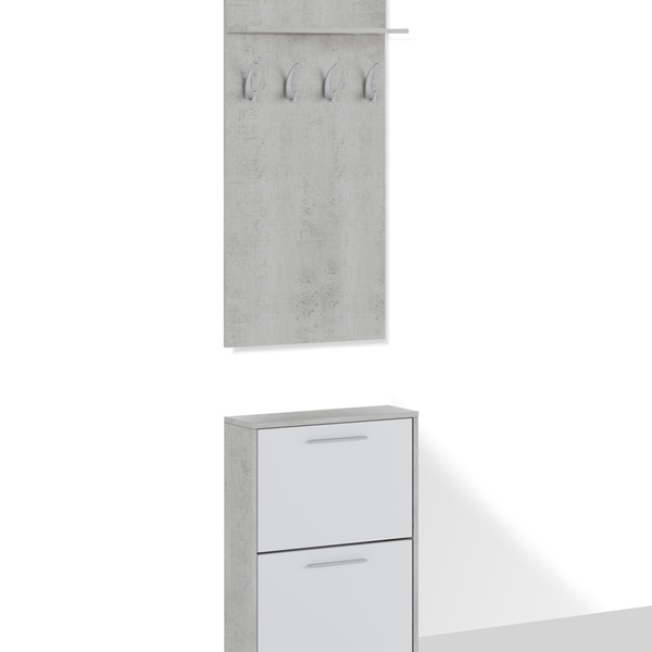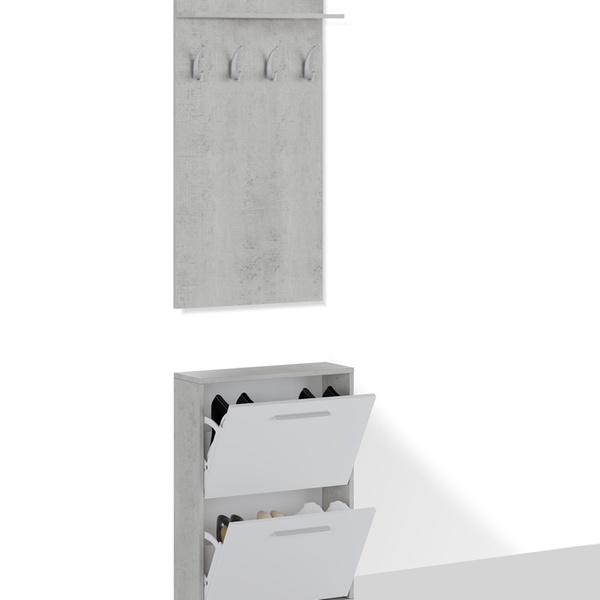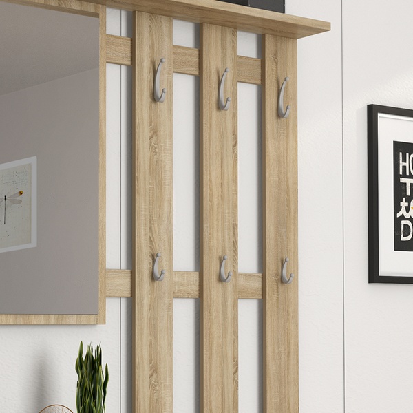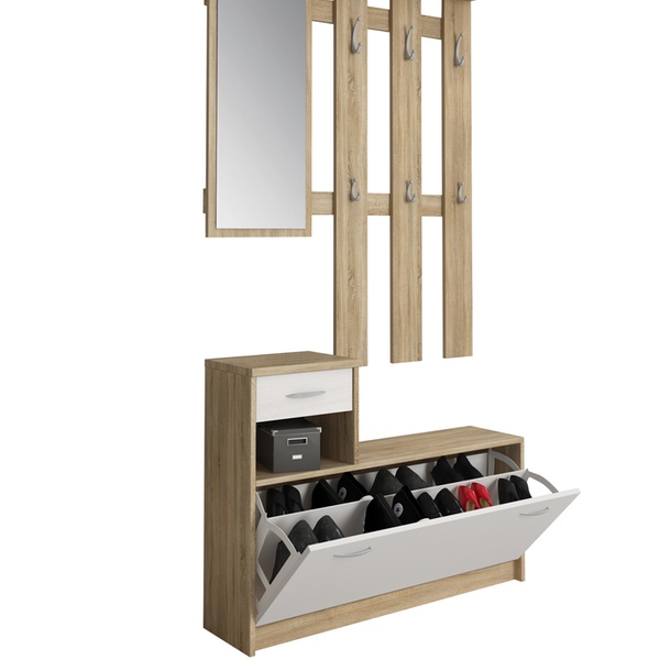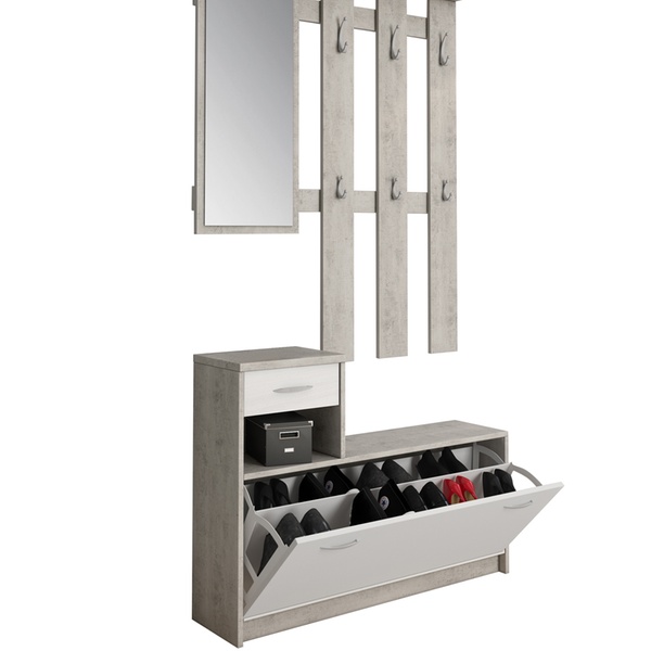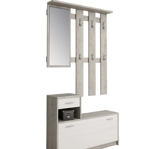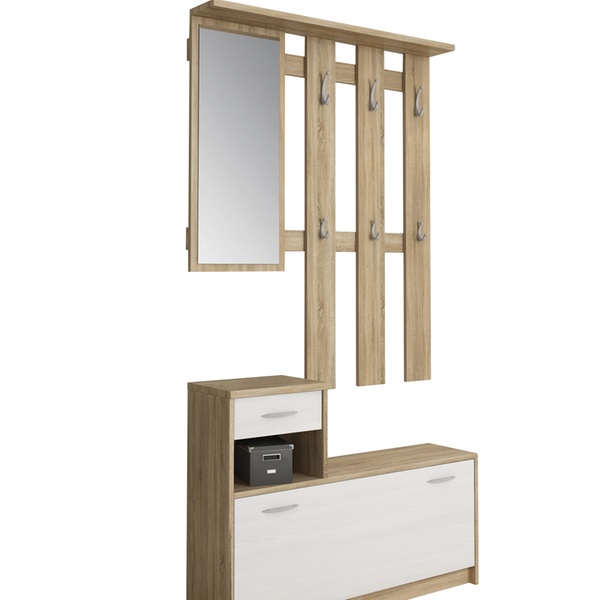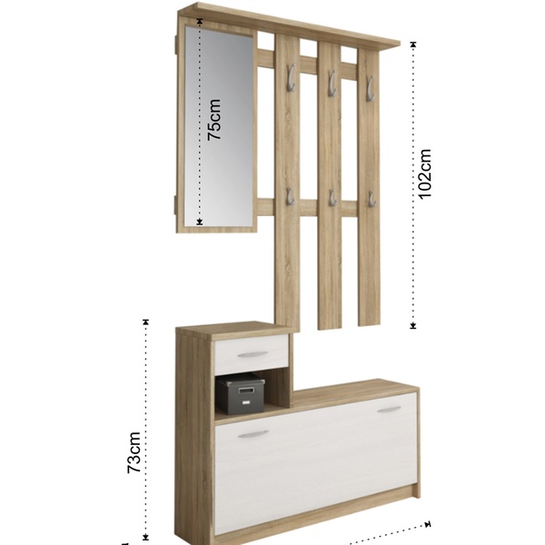 Este mueble es ideal para organizar la entrada o pasillo, cuenta con zapatero, espejo y percheros para bufandas, bolsos o abrigos