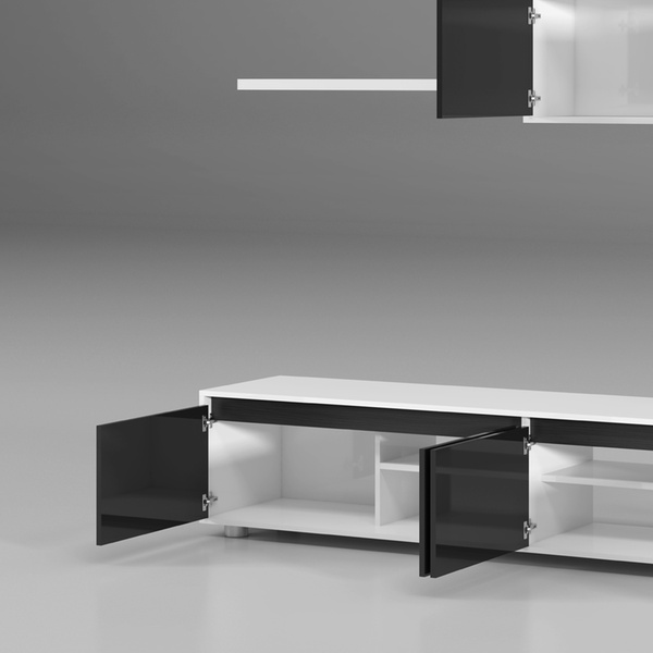 Un conjunto de muebles de salón en combinación blanco/negro brillante, ideal para decorar cualquier sala de estar