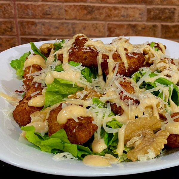 Rúcula, queso mozarella a la plancha, bacon ahumado, cebolla crujiente y mayonesa de albahaca