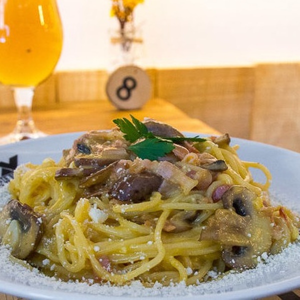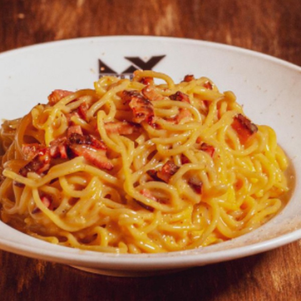 Carbonara: panceta adobada, yema de huevo, queso parmesano, pimienta y nuez moscada