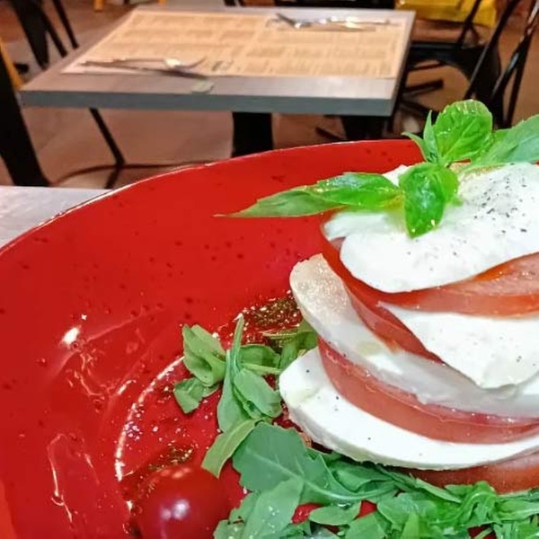 - Burrata: tomate cherry, mozzarela, rúcula, virtuas de parmesano, burrata, aceite de oliva virgen extra y albahaca