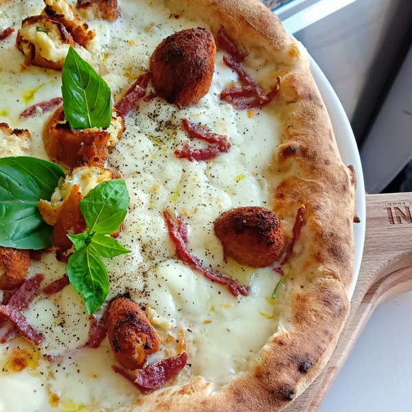 - Barbacoa: tomate, mozzarella, carne, cebolla, bacon, salsa barbacoa, aceite de oliva virgen extra y albahaca