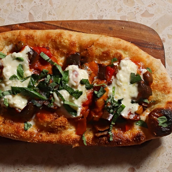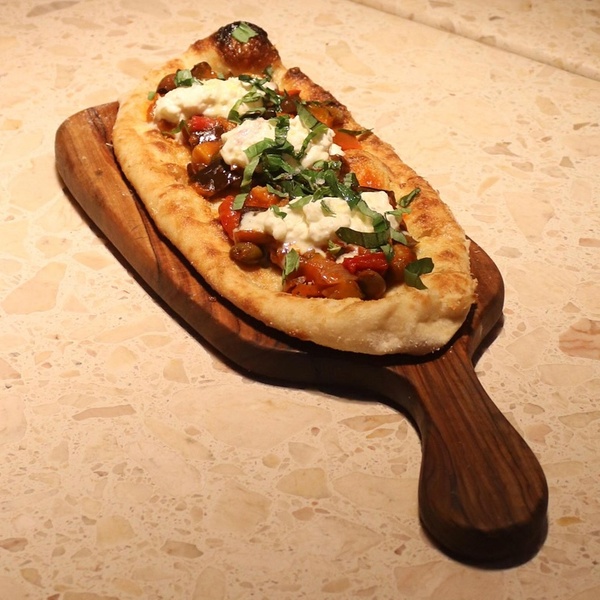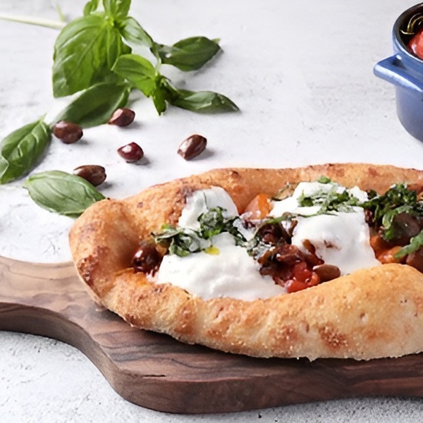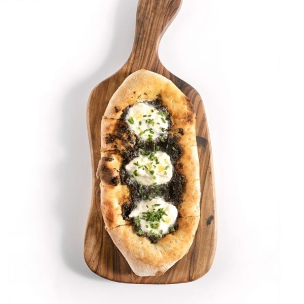 - Focaccina mediterránea: horneada al momento, con queso parmesano, pasta de trufa y stracciatella de burrata