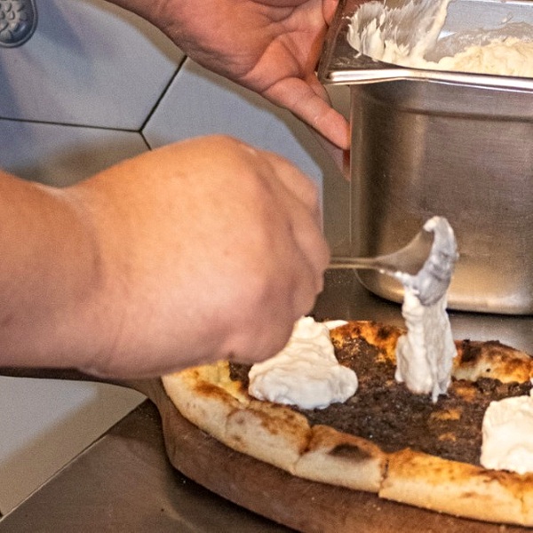 - Focaccina burrata tartufata: horneada al momento, con queso parmesano, pasta de trufa y stracciatella de burrata