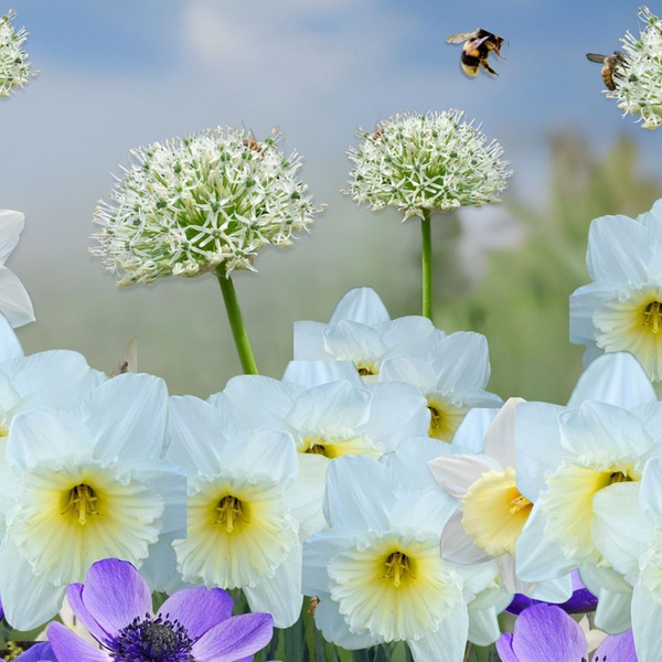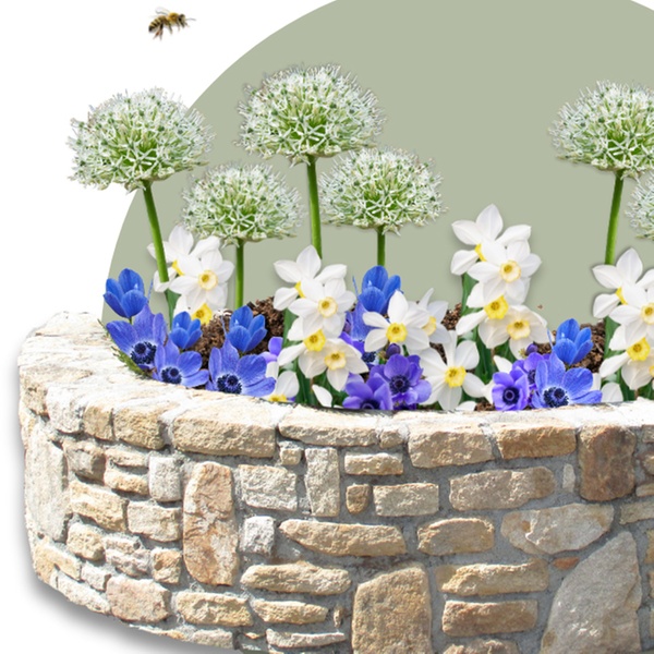 - Contiene tres tipos de bulbos: Anemone Coronaria Mr. Fokker (anémona azul intensa), Allium Nigrum (ajo ornamental blanco) y Narcissus Mount Hood (narciso blanco puro)