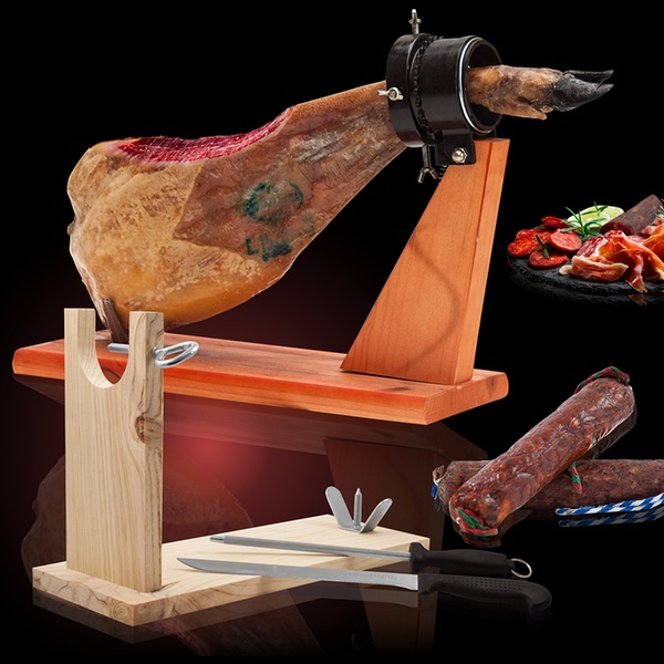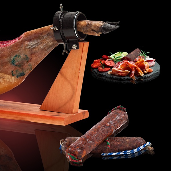 Paleta de jamón ibérico artesanal curado durante 18 meses, con salchichón y chorizo; con opción de jamonero con cuchillo y chaira