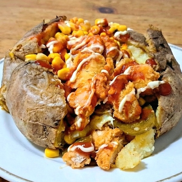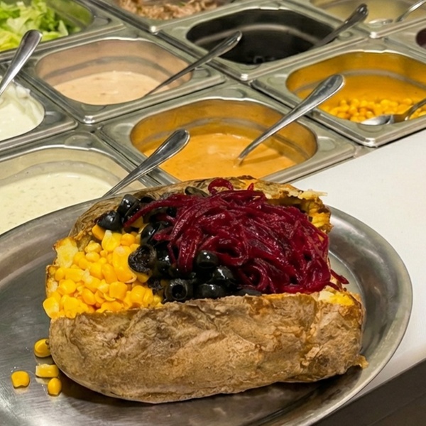 Patata asada Kumpir con 3 toppings (a elegir entre: maíz, jalapeños, remolacha, aceitunas negras, ensalada rusa, cebolla crujiente, repollo rojo, wurstel)