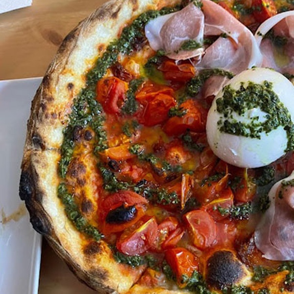 Pizza de la casa: tomate, jamón serrano, burrata y pesto