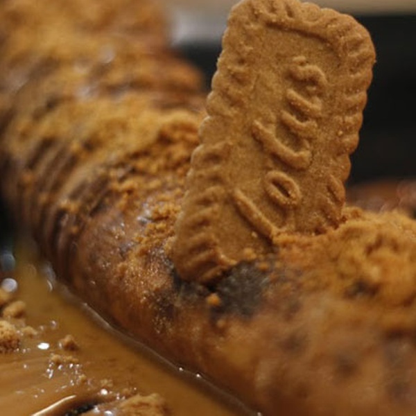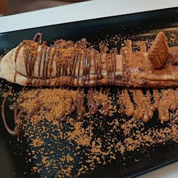 Pizzella de Lotus: pizza enrollada rellena de crema de Lotus, cubierto de chocolate blanco, Nutella y sirope de Lotus, con galleta triturada