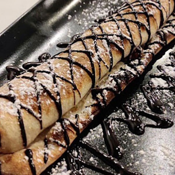 Pizzella de Nutella: pizza enrollada rellena de Nutella, bañada en sirope de chocolate y cubierta con azúcar glas