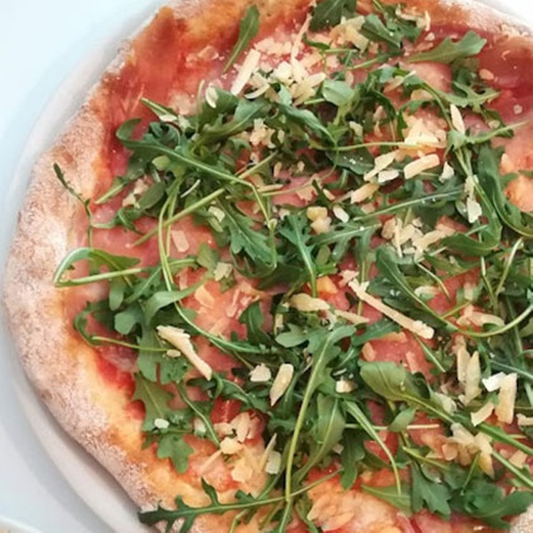 Pizza Caterina (TOP): tomate, mozzarella, queso de cabra, jamón serrano y rúcula
