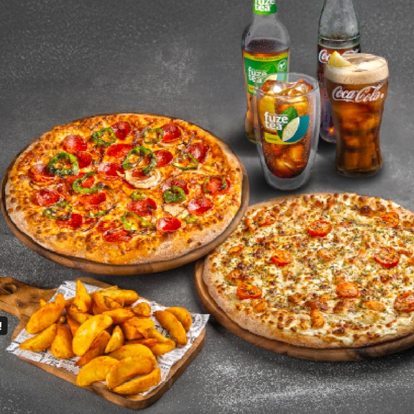 Elige 2 pizzas medianas de cualquier especialidad, 2 bebidas y 1 complemento entre alitas, nuggets, patatas gajo o aros de cebolla, ¡y prepárate para disfrutar más, por menos!