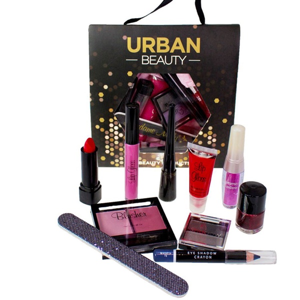 Este incluye una variedad de productos como esmalte de uñas, brillo de labios, máscara, brochas, etc