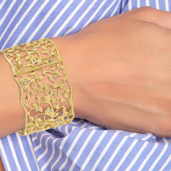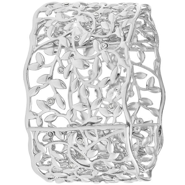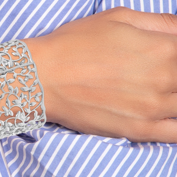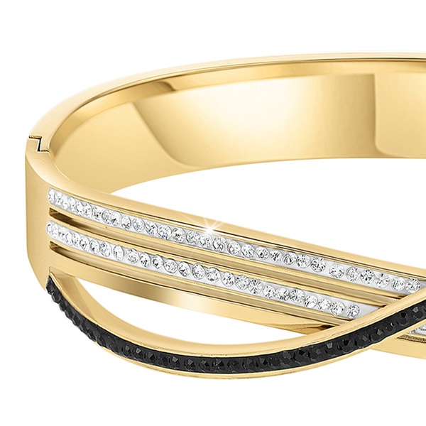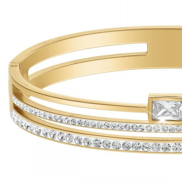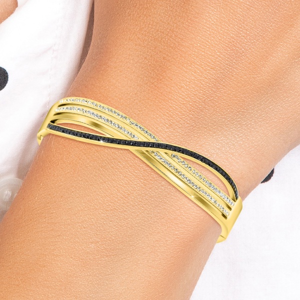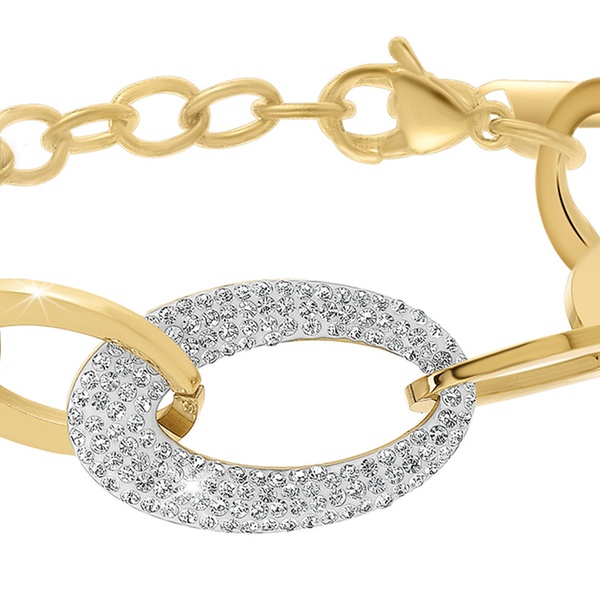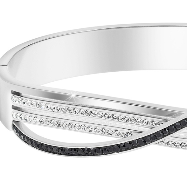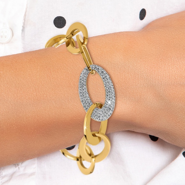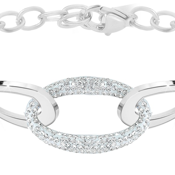 Esta pulsera de acero inoxidable, adornada con brillantes cristales, aporta un toque de elegancia a cualquier atuendo