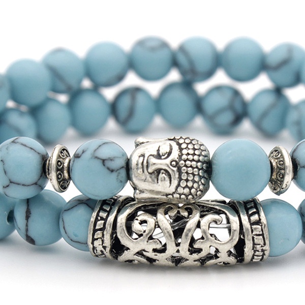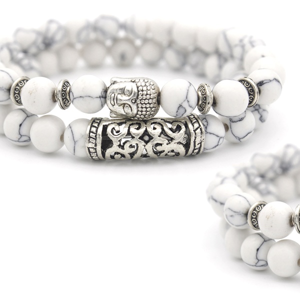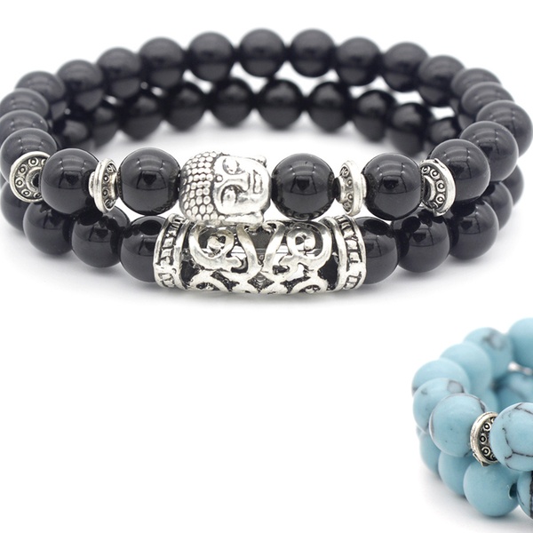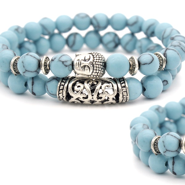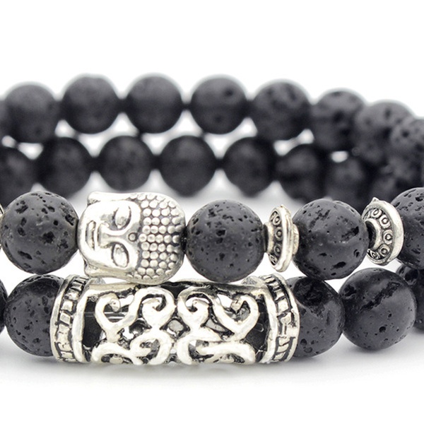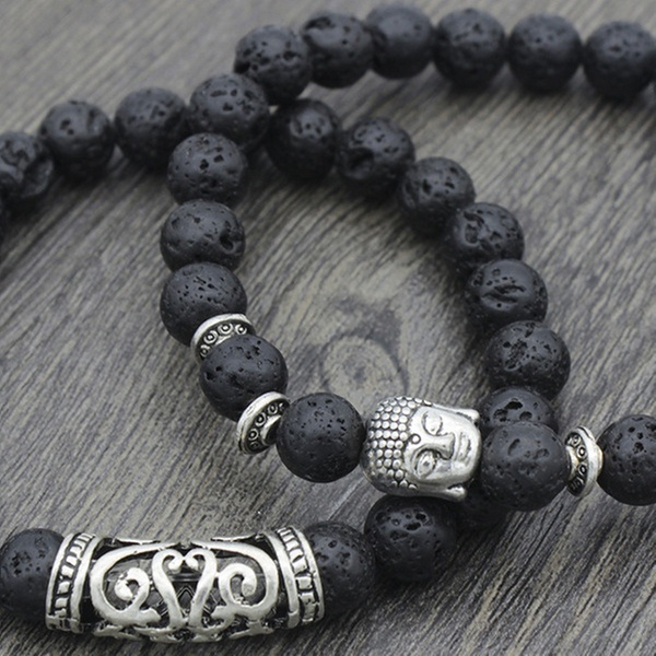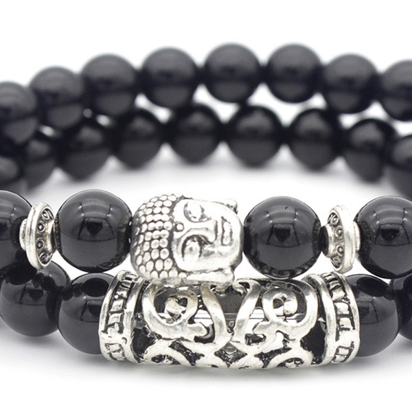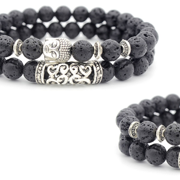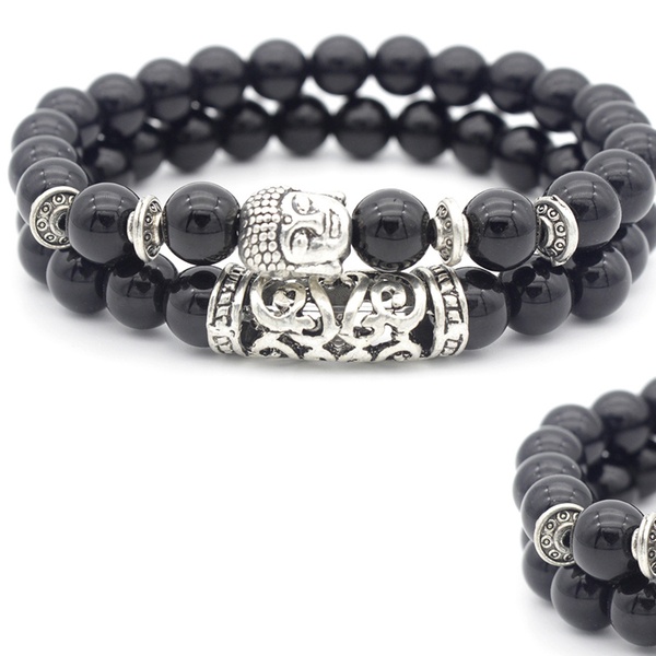 Con detalles y abalorios en forma de Buda en color plateado, esta pulsera de cuentas es ideal como regalo para familiares o amigos