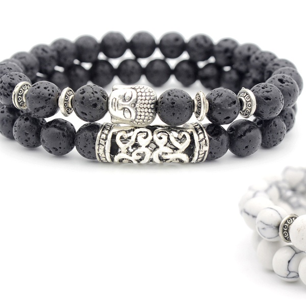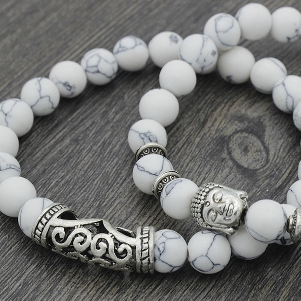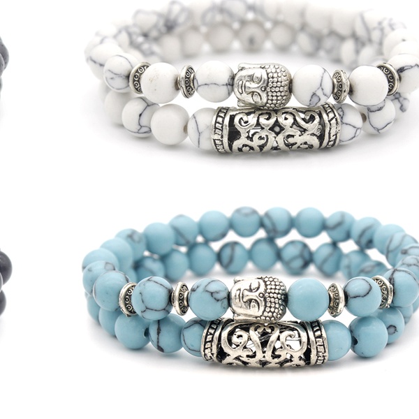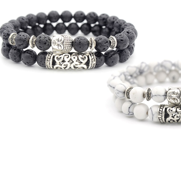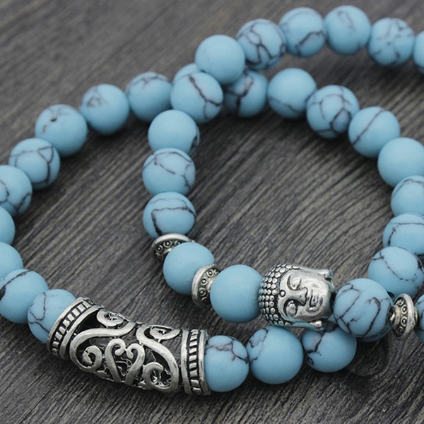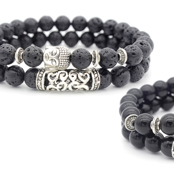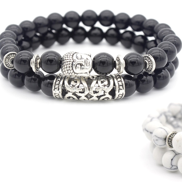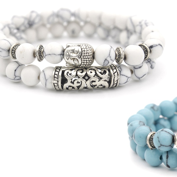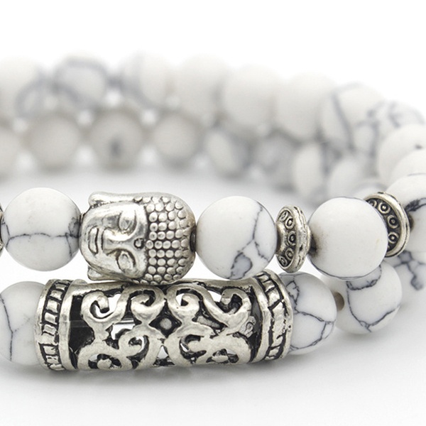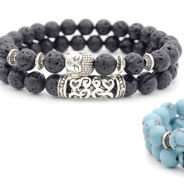 Con detalles y abalorios en forma de Buda en color plateado, esta pulsera de cuentas es ideal como regalo para familiares o amigos