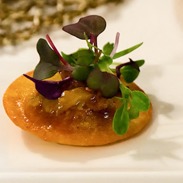 Chicharrón de bacalao con pil pil de coliflor y piquillos