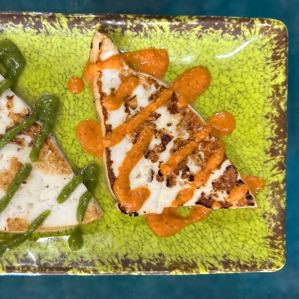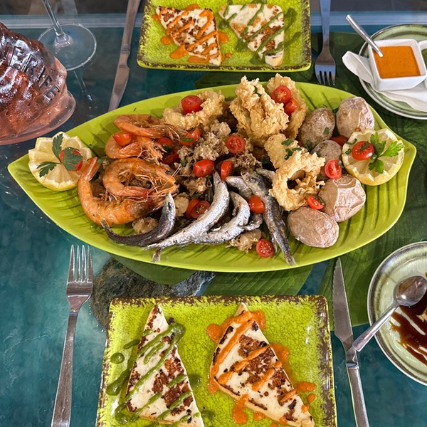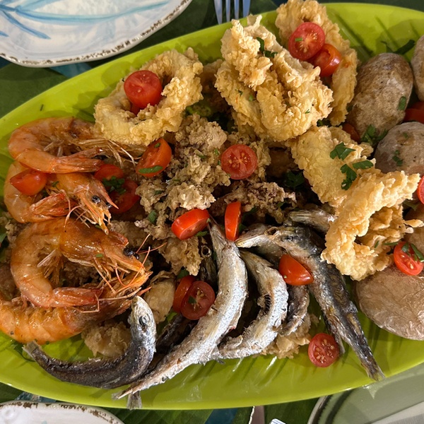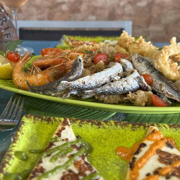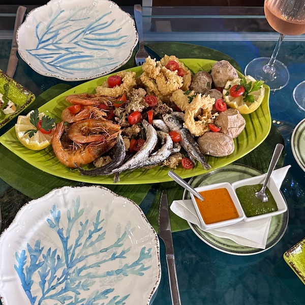 - Una parrillada de pescado cada 2 personas: con langostinos, calamares a la romana, chopitos, sardinas frescas y papas arrugadas con mojo rojo y verde casero