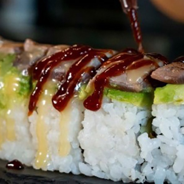 • maki mancora: tempura de langostino, queso crema, cubierta con aguacate, salmón, salsa de anguila y salsa de miel