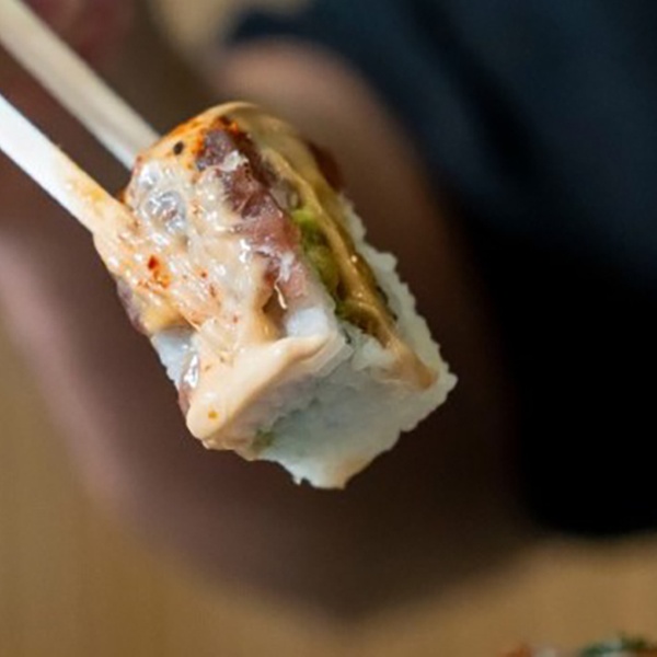• maki crunch: pulpa de cangrejo, queso crema y aguacate, envuelto de papel de soja y frito, cubierto con salsa de anguila, sala de miel y mayonesa picante