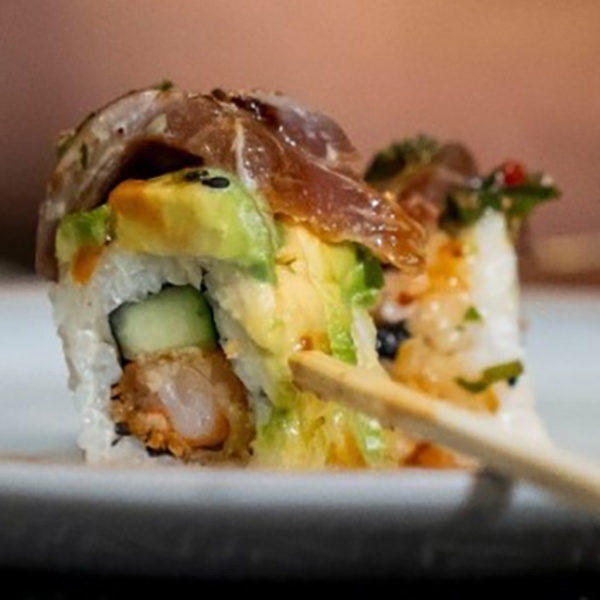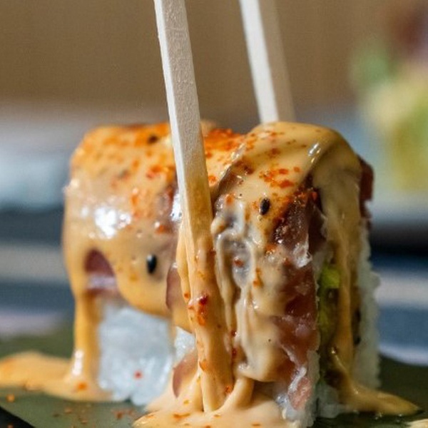 • maki acevichado: tempura de langostinos, aguacate, cubierto de atún y salsa acevichada