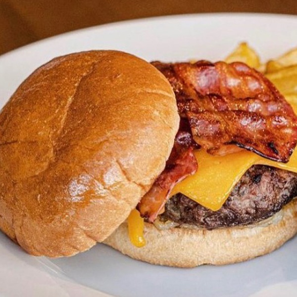 Burger clásica con ternera, queso, bacon, lechuga y tomate, acompañada de patatas