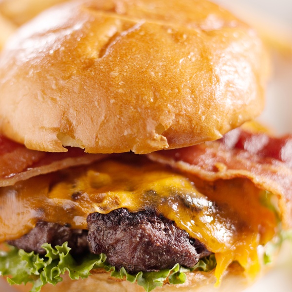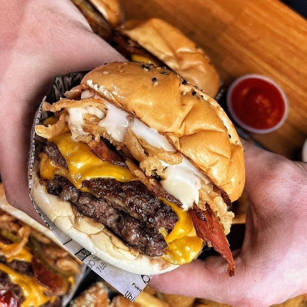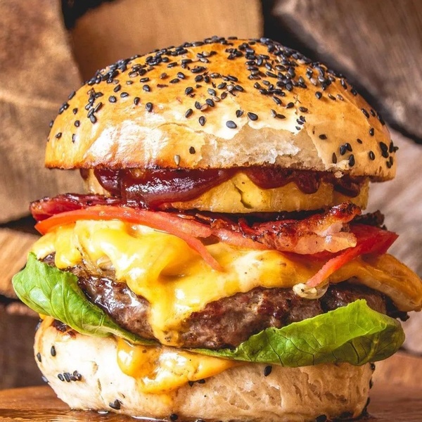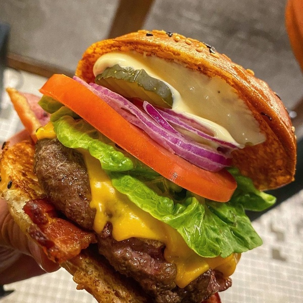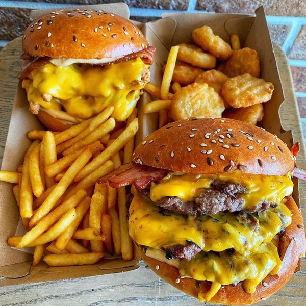 Disco de Angus de 200 g, con queso chedar, bacón, pepinillos, salsa especial y huevo frito en pan Brioche de mantequilla acompañada de papas fritas