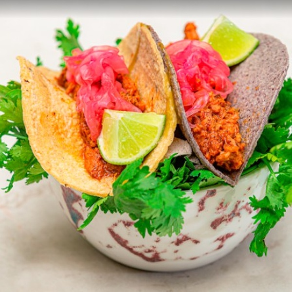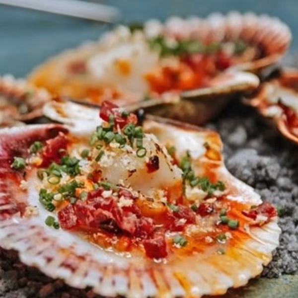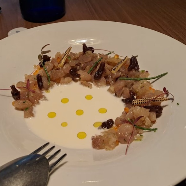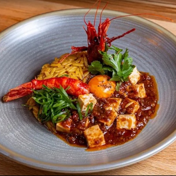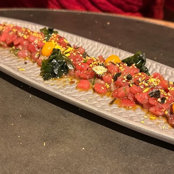 - Aguacate braseado, salsa de mango Avión y tartar de langostinos