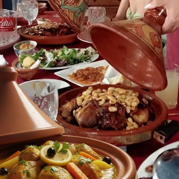 • Tajine de Pollo: Pollo tierno cocinado lentamente con limon y aceitunas.