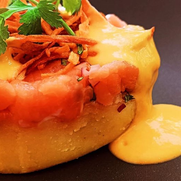 Causa rellena: puré de papas en pisos rellenos con ajíes, pollo y mayonesa, entre otros