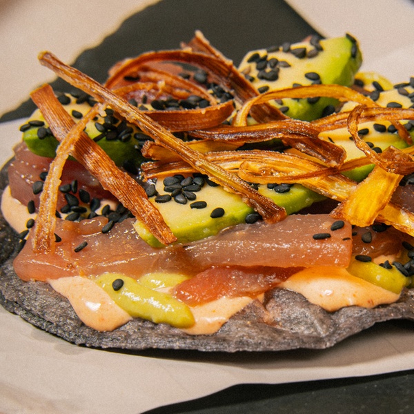 • Crujientes de atún, cubos de atún marinados en salsa ponzu, sobre crujiente de maíz. Acompañados de nuestra crema de aguacate, aderezo chipotle y puerro frito.