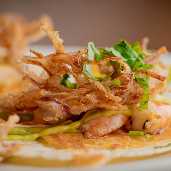 • Tacos diputado, langostinos salteados y gratinados con queso, sobre tortilla de harina de trigo, con cebolla tempurizada en tinta de calamar y mayonesa chipotle.