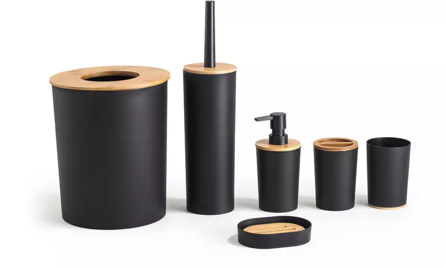 - Este juego de baño de 6 piezas de bambú está fabricado en plástico duro de calidad