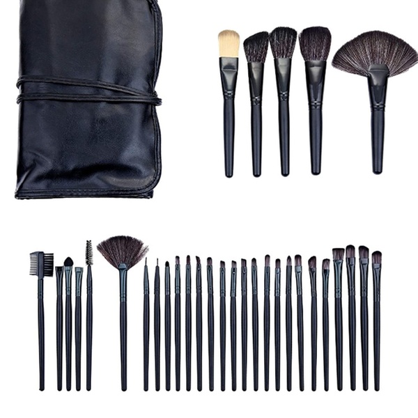 Este conjunto profesional de 32 pinceles con un elegante acabado negro es perfecto para todas tus necesidades de maquillaje, desde la base hasta las cejas, y viene en un estiloso estuche de imitación de cuero