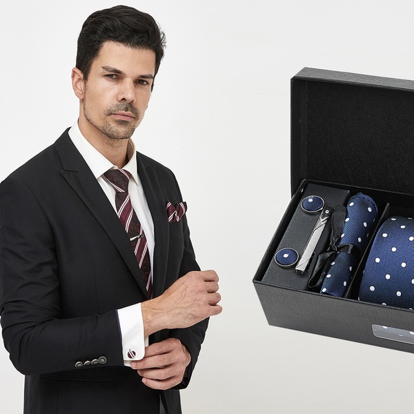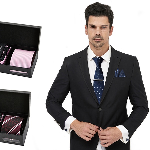 - Incluye corbata, gemelos, pañuelo y clip para corbata
