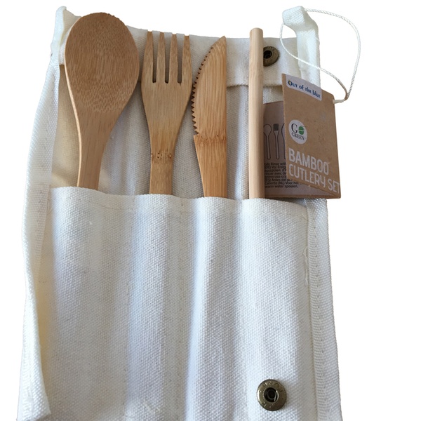 - Incluye: un cuchillo, un tenedor, una cuchara y una pajita de bambú en una bolsa de transporte