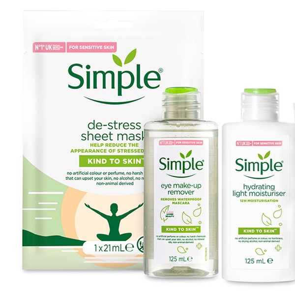 Este set de cosméticos faciales Simple incluye mascarilla desestresante, crema hidratante, limpiador, agua micelar y desmaquillante