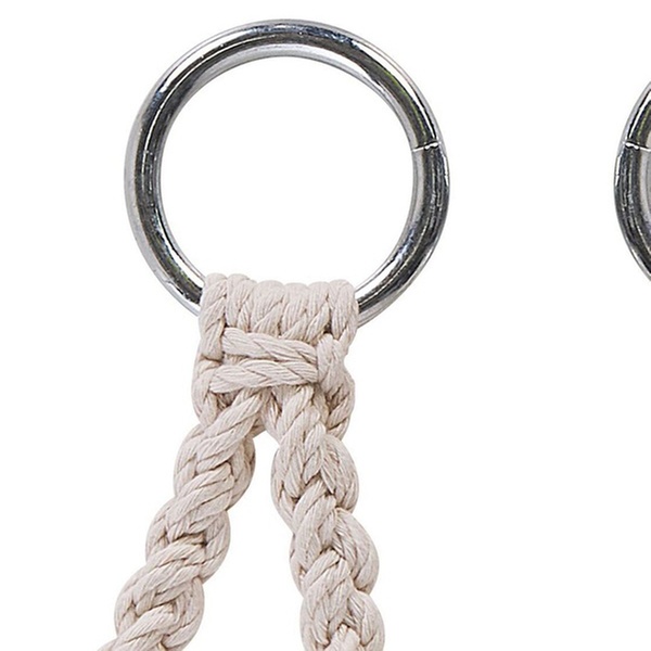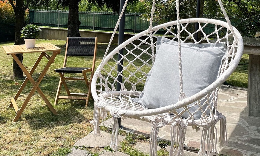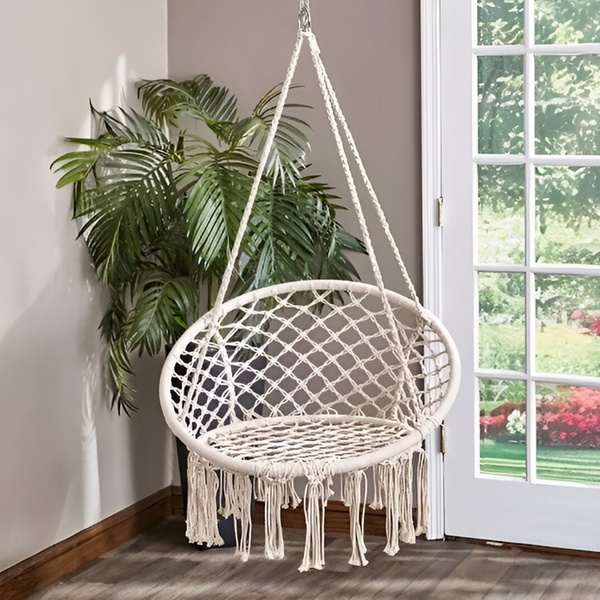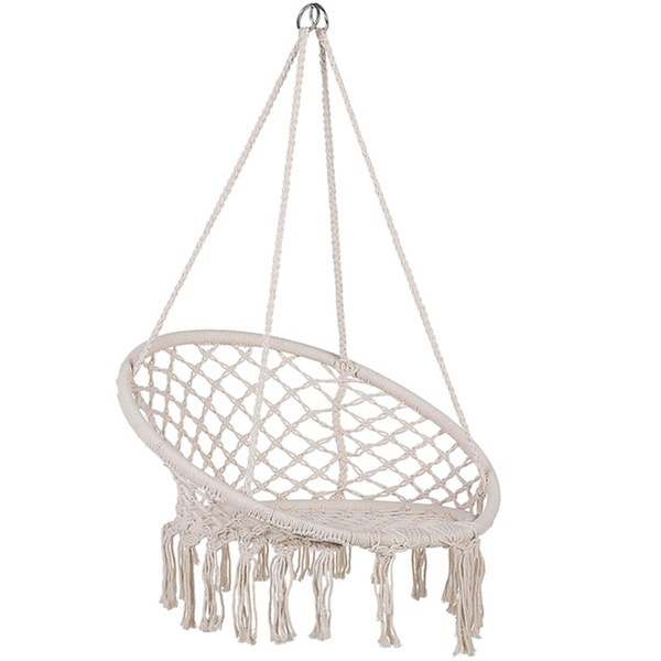 Groupon ofrece esta silla tipo columpio de cuerda de macramé con diseño circular, vendida por Zamika Store.