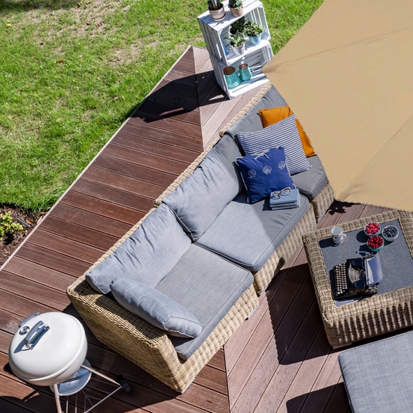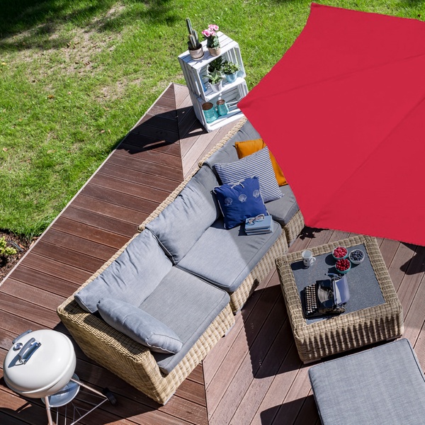 El diseño de esta sombrilla es ideal para balcones o patios pequeños, ya que se puede pegar a la pared o poner delante de una ventana