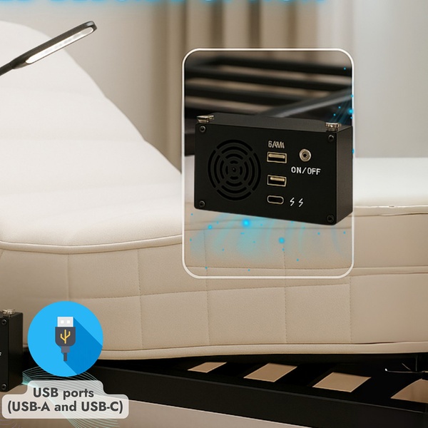 - Mesilla inteligente: altavoz Bluetooth, puertos USB (USB-A y USB-C) y lámpara de lectura