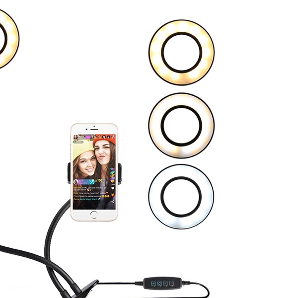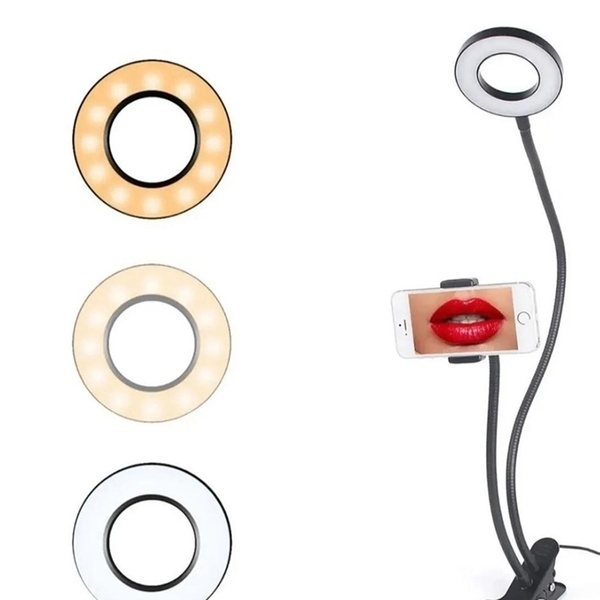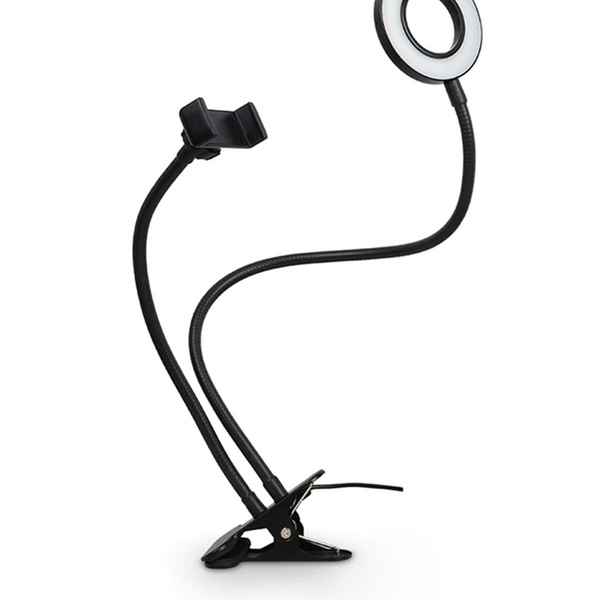 - Soporte para moviles de brazo flexible con anillo de luz LED y mando en el cable