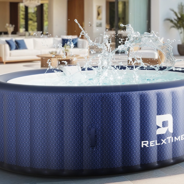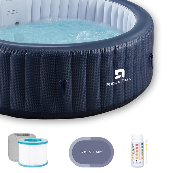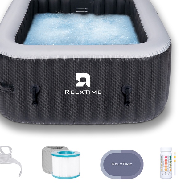 Spa hinchable RELXTIME disponible en dos formatos: cuadrado 4 plazas con 110 jets en negro y redondo 6 plazas con 130 jets en azul. Control integrado para temperatura hasta 40 °C, sistema de burbujas y filtrado