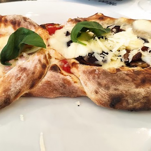 Pan de pizza cerrada, mozzarella, berenjena, longaniza y parmesano
