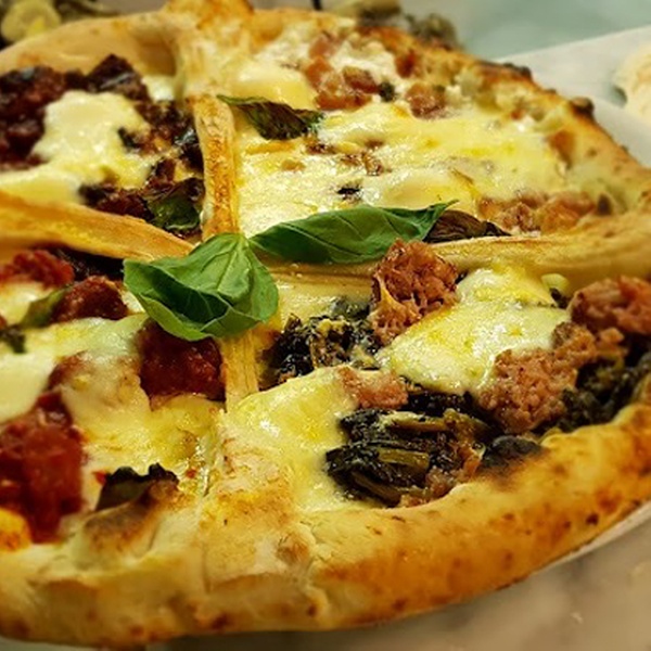 Mozzarella, tomate Cherry, longaniza, champiñones, parmesano y albahaca