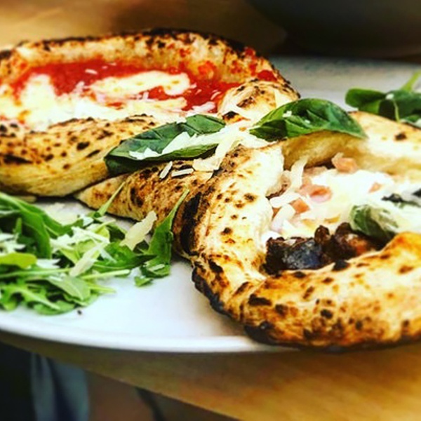 Pan de pizza relleno de mozzarella, jamon serrano, rúcula y parmesano